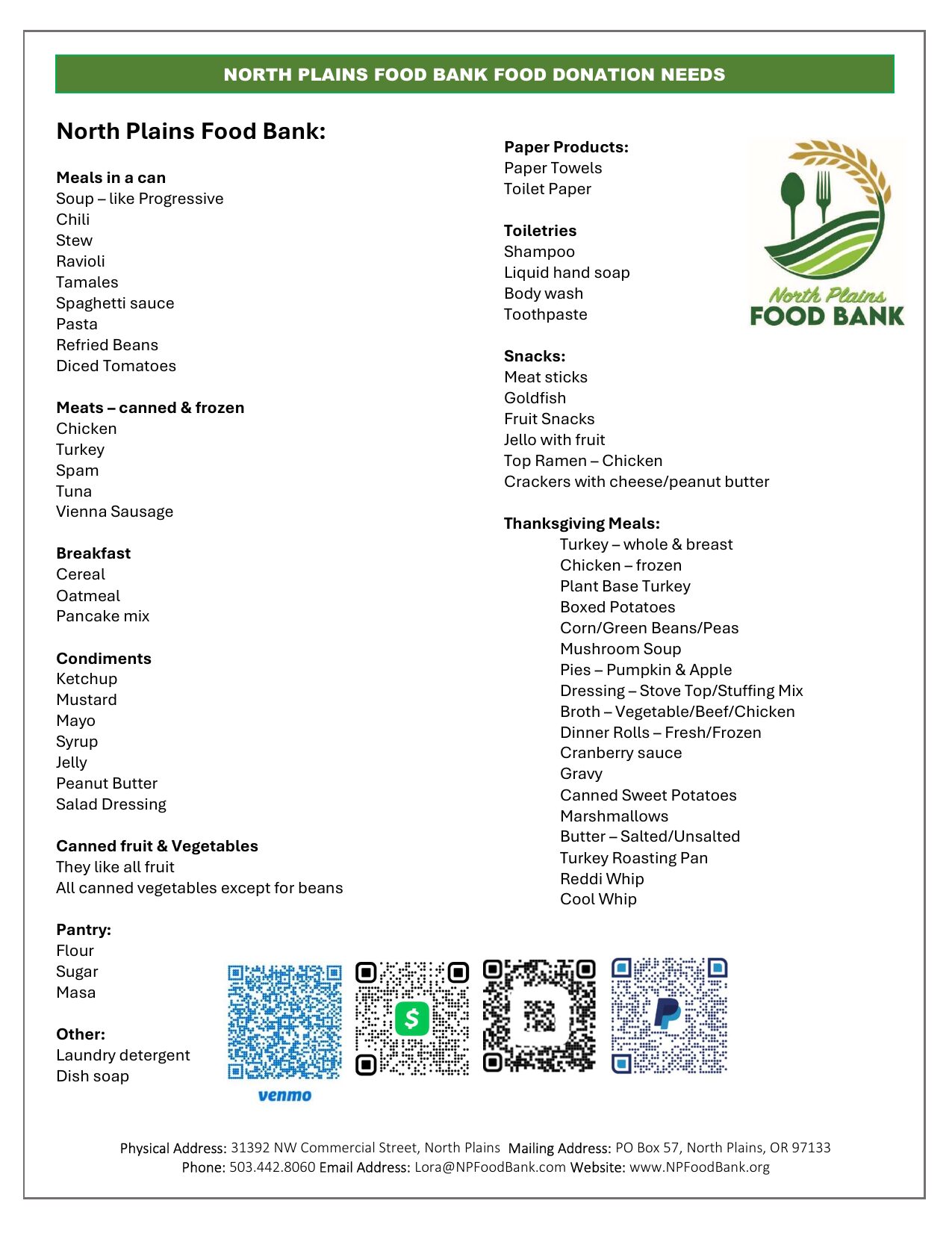 Please make checks payable to NORTH PLAINS FOOD BANK.